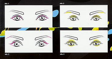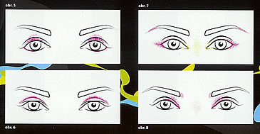 Malé oči zvětšíte aplikací světlých a zářivých očních stínů na pohyblivé víčko, použijete prodlužující řasenku, jemně perleťové stíny pod obočí a do oka světlou, bílou nebo béžovou, vnitřní linku. Vyvarujte se používání temných stínů a tužek. Absolutním tabu je pro vás černá. (obr. 3)